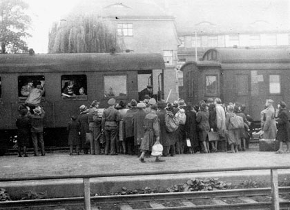 Wir kommen nicht mit! jammerte meine Oma. Es sah ganz danach aus, als hätte sie recht. Nun fauchte der Zug langsam in die Bahnhofshalle herein. Er stand noch nicht, da rissen die Leute schon die Türen auf und sprangen hinein. Alles drängte vorwärts. Wir wurden mitgeschoben. Die Menschen schrieen und schubsten meine Oma und mich bis ganz nach vorn, genau vor ein offenes Abteilfenster. Plötzlich packte ein Mann, der neben uns stand, meine Oma, hob sie in die Höhe und schob sie kopfüber durch das offene Fenster. Sie landete auf den Köpfen und Schultern der Leute, die dicht an dicht den Gang und die Abteile füllten. Sie wurde weitergereicht. Ihre schwarzbestrumpften Beine waren das Letzte, was ich von ihr sah. Der hilfsbereite Herr schob auch noch ihren Koffer hinterher. Schon hatte ich die Hoffnung, daß er mir auf dieselbe Art behilflich sein würde, da schwang er sich selber in das Fenster hinein. Jetzt war der Zug restlos vollgestopft. Keine Maus paßte mehr hinein. Männer, zu allem entschlossen, kletterten nun auf das Dach des Zuges. Andere klammerten sich außen fest, standen auf den Treppenstufen. Ein Fußbreit war noch frei auf einer Treppe ein Satz, und schon stand ich darauf, hielt mich mit einer Hand an der Eisenstange fest und preßte mit der anderen meine Reisetasche an mich. Der Zug fuhr ab. Irgendwo auf dem Bahnsteig stand meine Tante und starrte uns mit großer Sorge nach. Ich klammerte mich fest und bemühte mich, so stehenzubleiben. Erst in diesem Augenblick wurde ich mir der großen Gefahr bewußt, in der ich mich befand. Ich wagte keinen Blick nach rechts und links. Der Wind pfiff scharf an mir vorbei. Er wirbelte kleine spitze Steinchen auf. Die prickelten auf meinen Armen und im Gesicht. Auf der nächsten Station stiegen einige Fahrgäste aus. Da gelang es mir, in den Zug hineinzukommen. Eingeklemmt zwischen vielen Menschen, sah ich mich nach meiner Oma um. Schon bald merkte ich, wo meine Oma war. Immer, wenn sich ein Reisender einen Weg durch die Menschen bahnte, um zur Toilette zu gehen, wurde zuerst jemand mit einem schwarzen Hut aus dem Toilettenraum hinausbefördert. Das war sie. Oma!