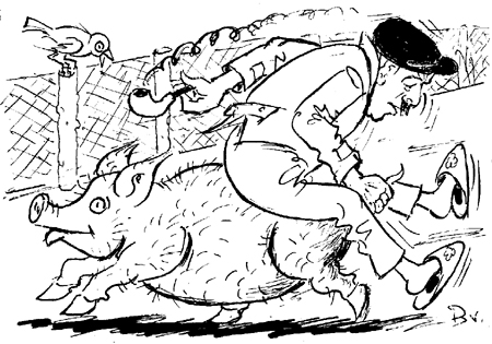 Und dann passierte es einmal: Die schon recht ausgewachsene Wutz geriet beim ausgelassenen Umhertollen zwischen Konrads Beine. Plötzlich saß er rücklings auf dem Schweinerücken; und dann ritt Konrad heidi! auf dem Rücken des Borstenviehs im Schweinsgalopp über den Hof, plumpste nach gut zehn Metern runter vom Saurücken und saß verdattert auf dem Beton des Hofs. Vergebens hatte er versucht, sich am Schweineschwänzchen festzuhalten. Verbiestert schüttelte er den Kopf; grimmig grinsend rappelte er sich auf bei unserem wiehernden Gelächter aus dem Küchenfenster.