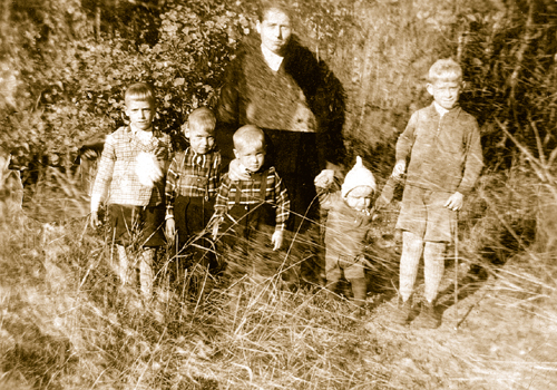 Foto zum Text.Joachim, links, seine Mutter und seine vier Brüder zu Hause in Glietzig, Pommern, etwa 1944.