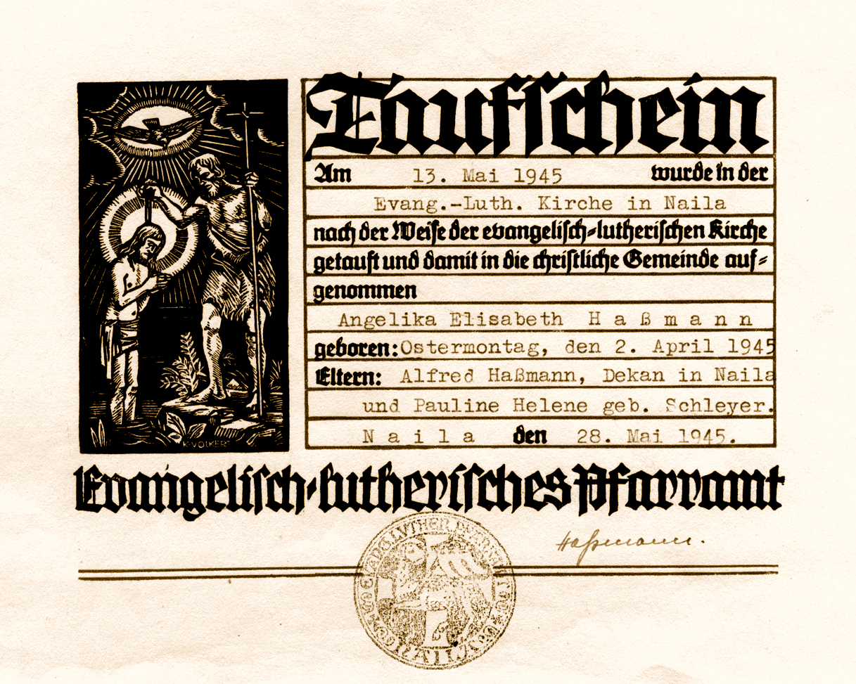 Foto zum Text.Das ist nicht der Taufschein von Lottchen, sondern meiner, aber der von meiner Puppe sah genau so aus.
