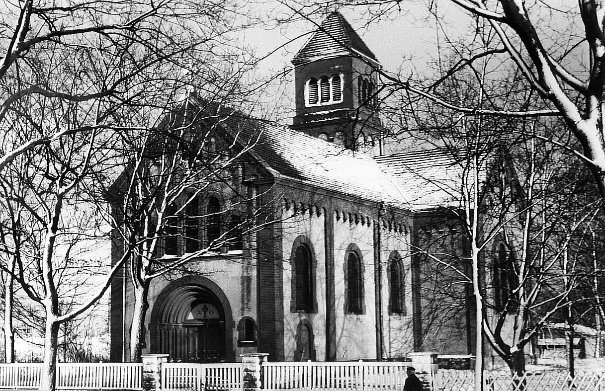 Unsere katholische Kirche „Heilige Familie" in Rüdersdorf im Winter 1999. Sie wurde 1905 im neuromanischen Stil erbaut. 1965 erhielt sie eine moderne Ausstattung. 2005 wurde sie saniert und bekam 2014 ein neues Geläut.