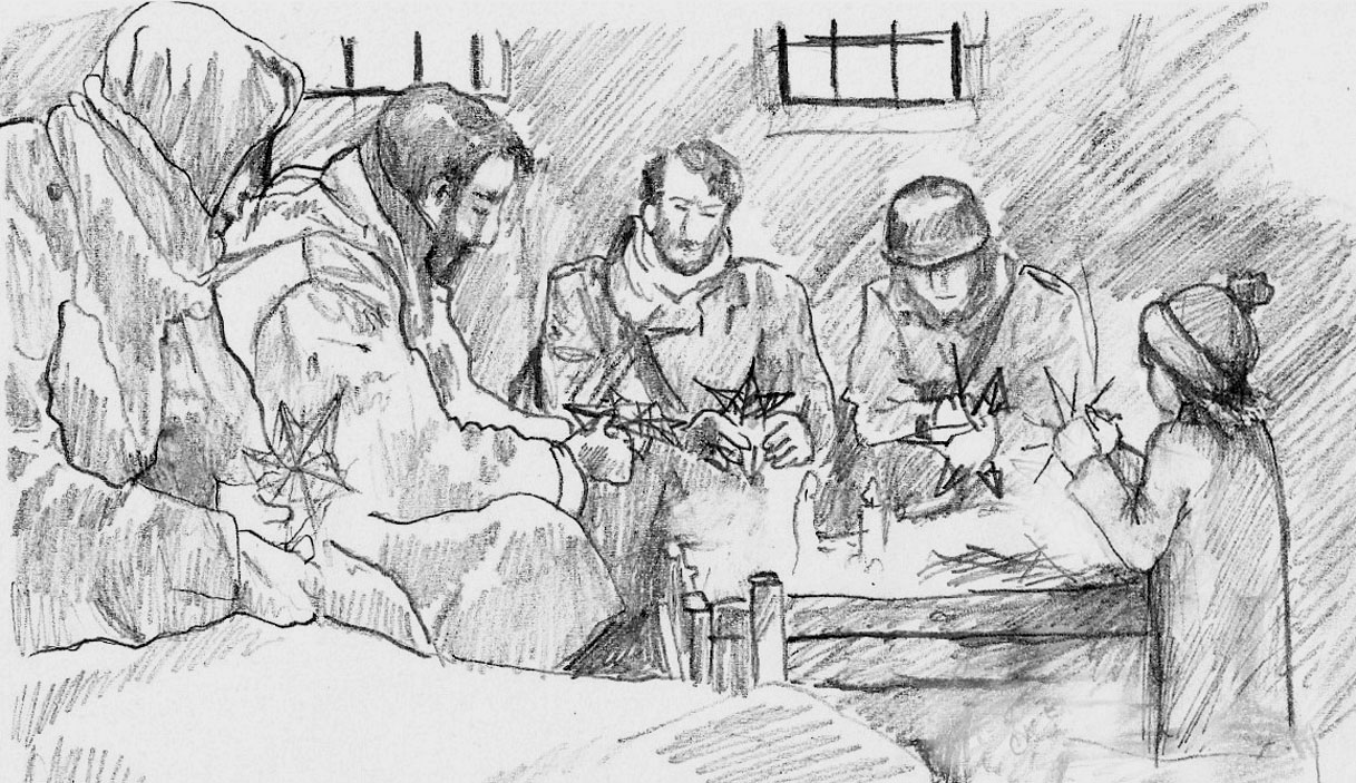 Heiligabend 1944 im besetzten Belgien: Wehrmachtssoldaten basteln mit einem kleinen belgischen Mädchen Strohsterne. Skizze/Zeichnung: Friede Metzner.