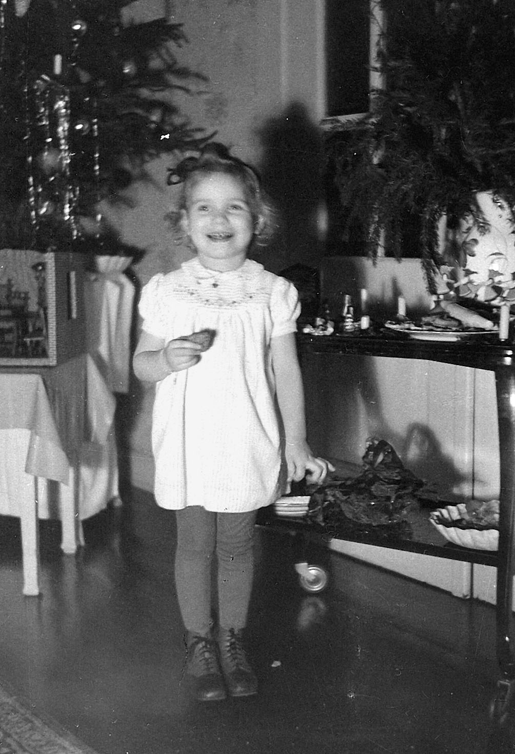 Mein Vater machte sofort ein Foto von mir mit meinen neuen Schuhen vor dem Weihnachtsbaum.