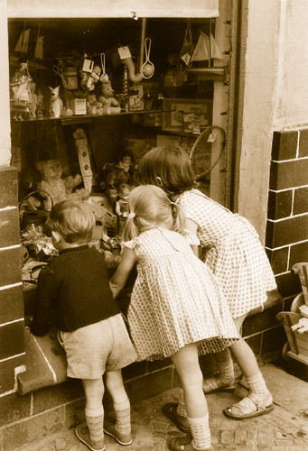 Foto zum Text.25 Jahre später, im Sommer 1963, vor einem Spielzeugladen in der gleichen Straße.