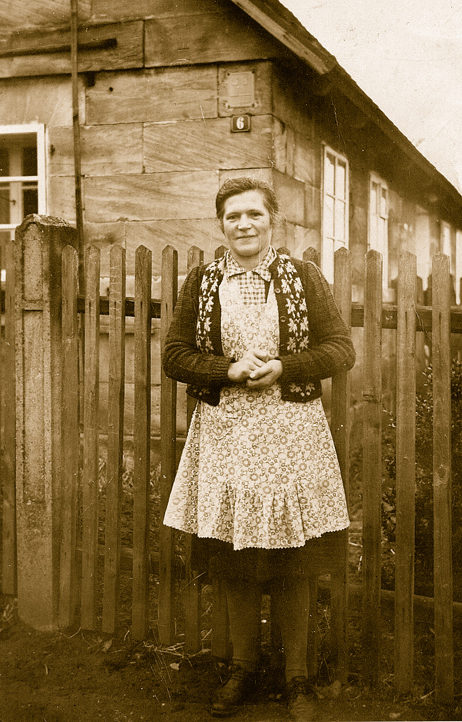 Foto zum TextOma Anna steht1946 vor ihrem Haus.