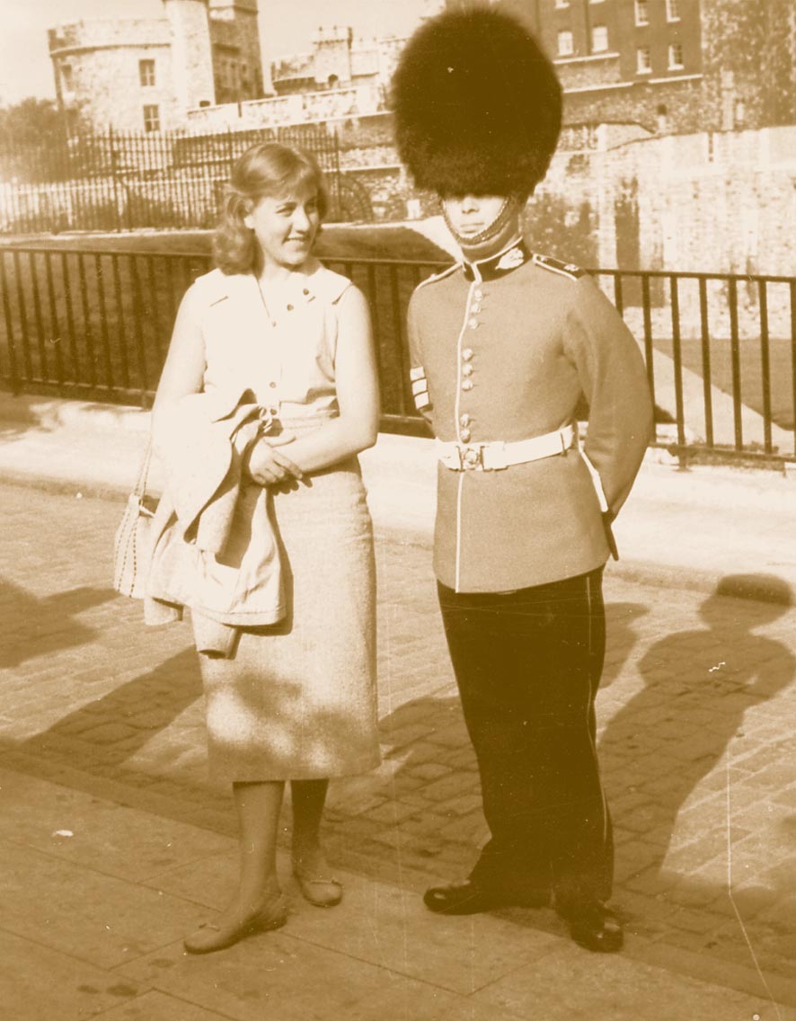 Au-Pair-Mädchen Ulla mit einem Bobby in London.