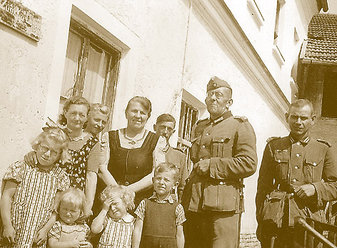 Meine Familie während des Krieges. Unsere Mutter steht in der Mitte, vor ihr stehen meine Schwester Cilli, ich und mein Bruder Alois, ganz links unsere geistig behinderte Schwester Else.